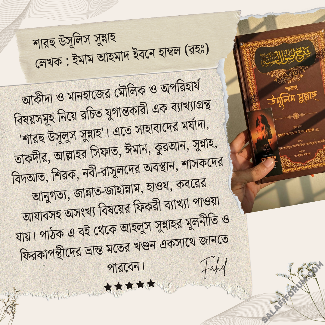 আকীদা ও মানহাজের মৌলিক ও অপরিহার্য বিষয়সমূহ নিয়ে রচিত যুগান্তকারী এক ব্যাখ্যাগ্রন্থ 'শারহু উসূলুস সুন্নাহ'। এতে সাহাবাদের মর্যাদা, তাকদীর, আল্লাহর সিফাত, ঈমান, কুরআন, সুন্নাহ, বিদ‘আত, শিরক, নবী-রাসূলদের অবস্থান, শাসকদের আনুগত্য, জান্নাত-জাহান্নাম, হাওয, কবরের আযাবসহ অসংখ্য বিষয়ের ফিকরী ব্যাখ্যা পাওয়া যায়। পাঠক এ বই থেকে আহলুস সুন্নাহর মূলনীতি ও ফিরকাপন্থীদের ভ্রান্ত মতের খণ্ডন একসাথে জানতে পারবেন।