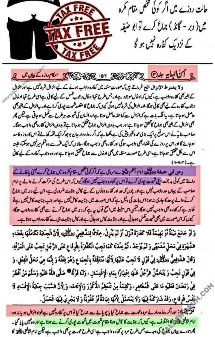 ১. রোযা রাখা অবস্থায় যদি কোন ব্যক্তি পায়ুপথে সহবাস করে, তাহলে এটার জন্য আবু হানিফার ফতোয়া অনুযায়ী কোন কাফফারা দিতে হবে না। [ইহসানুল হিদায়া- ৩/১৫২, রোজার আহকামের বর্ণনা]